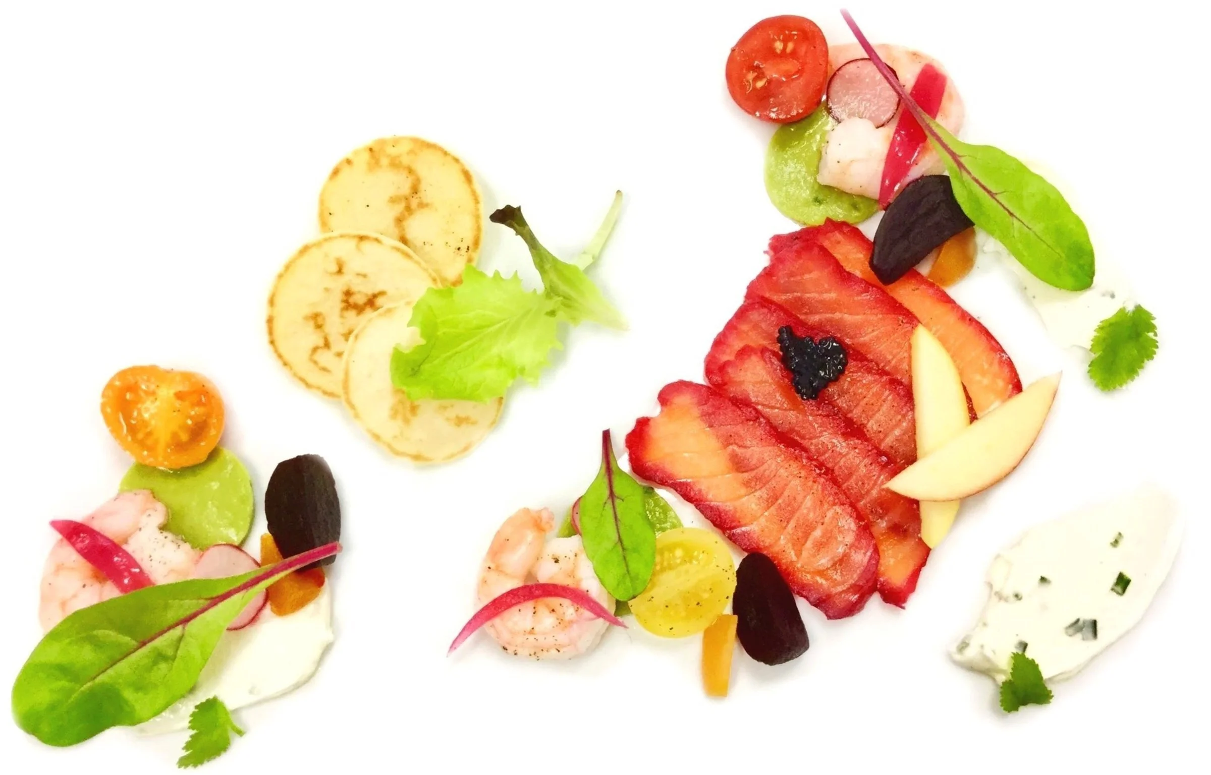Crevettes et guacamole de fèves édamames de la Ferme EdaNature, de Saint-Valérien-de-Milton, La faisselle de l’Isle d’Orléans , caviar & blinis à la farine de quenouilles des Jardins Sauvages.