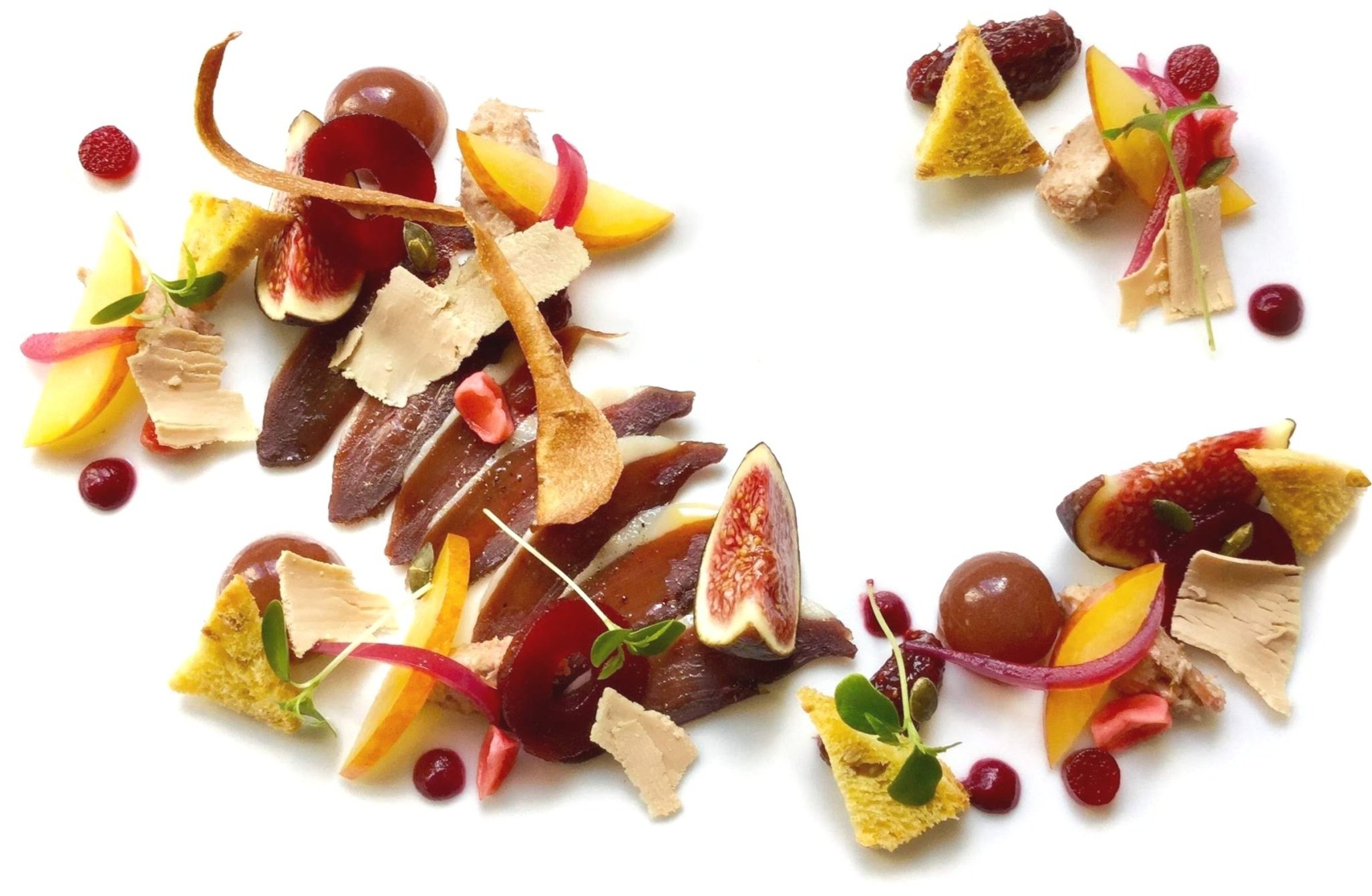 Magret de canard fumé, copeaux de foie gras, pain brioché aux graines de citrouille, figue de la Vallée du Moulin, chips de panais, gel aux fruits rouges.